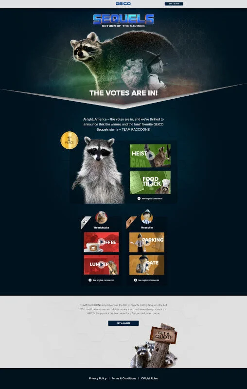This promotion offered visitors the opportunity to view two continuations of previous GEICO commercials, vote for their favorite character, share their vote. Prime motivation to vote was a chance to win a bag of GEICO swag, including a $100 movie card from a daily drawing.